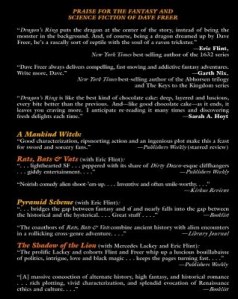 >Dave, that short swim — which I fear will end with a trip over the waterfall for me — is what is so frustrating. Especially when you add in the fact that so many agents and publishers want to know, up front when you first submit to them, what you are going to do to promote your book. How the hell do I know what I'm going to do? I don't know at that point when the book is coming out, what format it will be in, how many copies will be run, where it will be released, etc. So, is it okay if I grab onto the end of the tail of the new breed of uplifted elephant shrew and have it drag me to the coffee so I can keep writing? ;-pAs for your question, the cover looks wonderful. The quotes are great and just be prepared for the fact that when — not it, I'm being positive here — I finally get to the point of having a novel cover, I'm coming to you for help. Now quit looking for a rock to hide under, I promise I'll only ask a hundred times or so and then I'll leave you alone. [VBG]