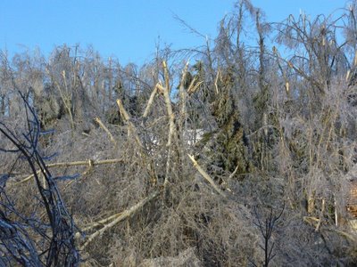 Mile after mile of bare trees and lush evergreens showed some of the oddest damage. Upper limbs were broken and scatted around on the ground. Some hung from threads higher up. Others had fallen with such force that they were impaled in the ground. But unlike damage from tornadoes or high wind, these limbs looked as if they’d simply snapped and fallen straight down. Almost as if someone or something had stepped on them, realizing after causing the initial damage that something sharp was sticking them and moving away before demolishing the rest of the tree. I wish it hadn’t been raining so I could have gotten a photo.