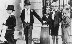 The two Toffs are Peter Wagner and Tim Dyson from Harrow public school. It is the day of the Eton-Harrow cricket match at Lords and the two boys are required to attend in Sunday Dress. They are waiting at Grace Gates for the Wagner family to arrive by car.