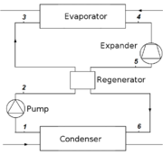 The typical arrangement of equipment is shown in the schematic above. The working fluid is heated to a dry, saturated vapour that expands through a turbine, delivering work (the Expander in the diagram). It is condensed back to a liquid and pumped back to the Evaporator where it is heated back to dry vapour. Typically a Regenerator is added to increase efficiency, preheating the condensed liquid before it enters the Evaporator.