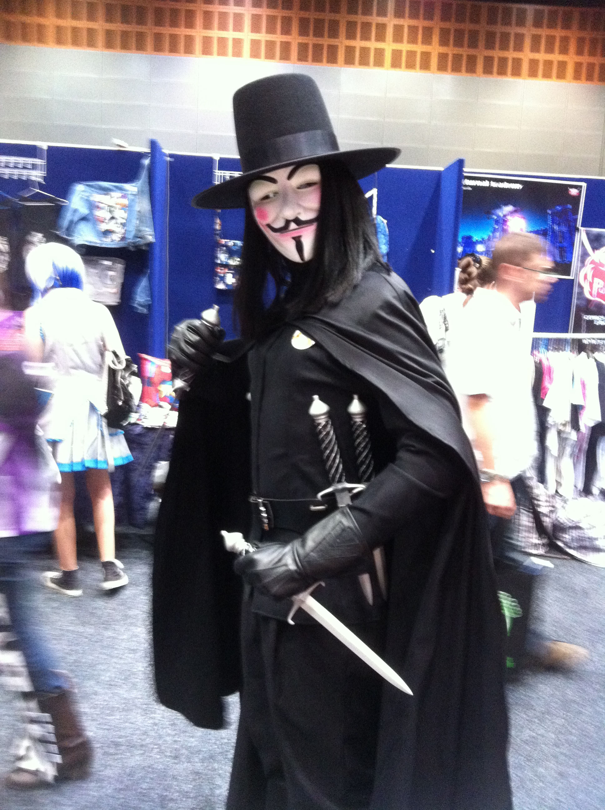 The crow rocks! And I wonder how many Americans would see V and think “V for Vendetta” as opposed to thinking, “oh gees, don’t tell me—either Occupy is protesting the Con or Anonymous hacked the registration computers.”