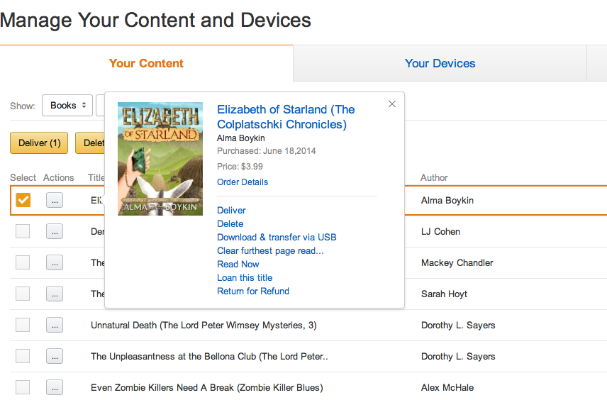 Ok, now you have this nice library on Calibre. What if you want to put these shiny converted books onto a device? Well, the simplest way is likely to sideload them from your computer to your device using a USB cable. Plug the device in, wait for it to show up on the menu, then click and drag and drop files into the proper folder. I can’t get a lot more specific: every device is a little different. I can give you hints. For a nook, you will need to use Adobe Digital editions, as described here. For a kindle, you can use your kindle email address which is given to you in the “Manage Content & devices” area, and send the .mobi file to the device over wifi. If you are loading onto a phone or other device, look for ‘library’ or sometimes the app will have a folder.