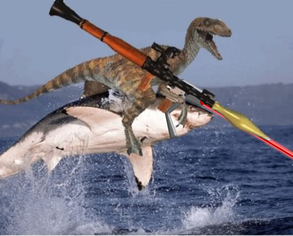 Also, that’s a velociraptor holding a rocket launcher riding a shark, right?