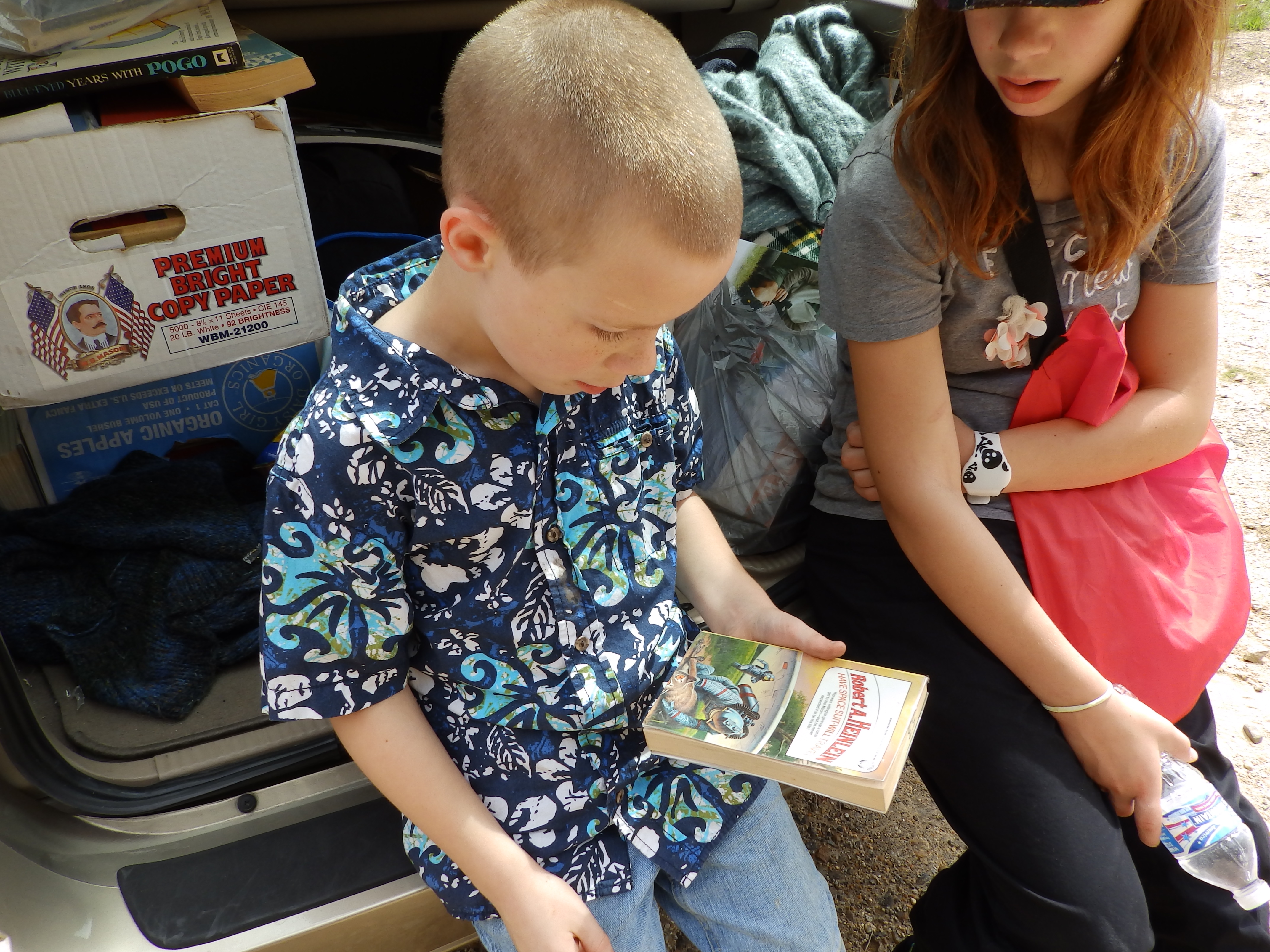 I’m on vacation in New Hampshire this week, dodging the rain and taking my kids to lots of used book stores! I was originally going to do an open floor, but the younglings agreed to let me interview them around the dinner table tonight. Here is the transcript, with me as Mother-Thing, the 15 yo as Eldest Child, the 14 yo as Redhead, the 12 yo as Junior Mad Scientist (you should hear the evil laugh, it’s the MOST adorable thing ever), and finally, the 9 yo as The Little Man.