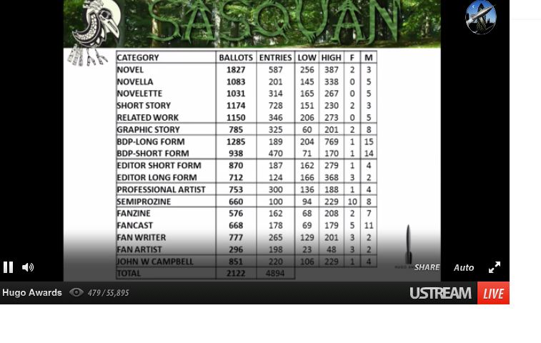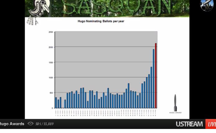 […] Yesterday afternoon was exciting. For the first time since becoming involved in the process, I didn’t feel like my Hugo nomination had simply disappeared into a black hole. I also got the thrill of hearing my name as one of the nominations. I am honored and humbled by that. My personal involvement with organized fandom began not too long ago, but from the beginning, I felt like I’d found my home. I can remember when I was much younger, looking for the collections of ‘year’s Best SF’ in the library and devouring them. Then I started to learn that maybe I should avoid the Hugo-award winning ones, because they weren’t all that good. For a few years now, I’ve thought about changing that. I’ve advocated to get more people voting in the Hugo, educating fans that yes, this is an award they ‘can’ have a say in. […]