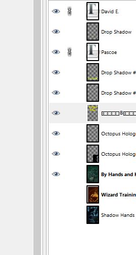 Using Save As, name and save this file, then repeat with changing the title and the art for each cover you are doing. Dave had six, but it took very little time once I had every thing set up to manipulate the art and GUE under the layers of the text and modifying elements (drop shadows and that sort of thing).