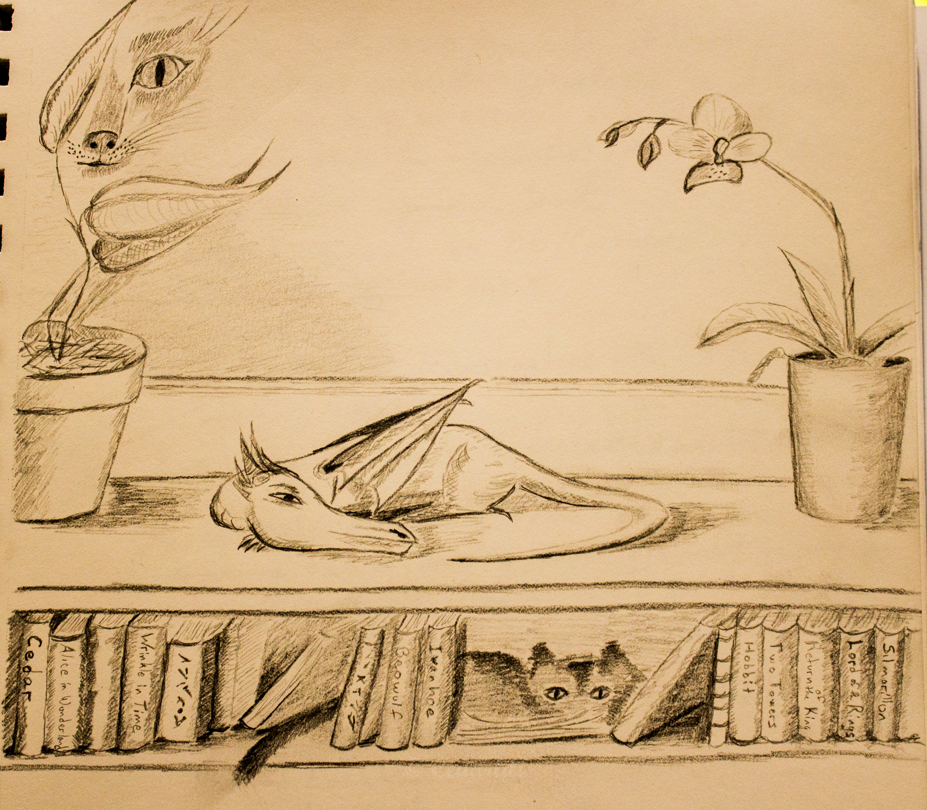 Necessarily, on days I can’t think, I can’t write. I can, usually, manage to do homework, but that’s not creativity. Art, in a visual sense, is creativity but not as challenging to the tired brain as writing is. I think because of the scope: my art isn’t terribly complicated stuff that will take weeks to complete. A novel is. Maybe that’s what it is. It’s just so overwhelming to try and contain a world in your brain when there is all this other stuff demanding space and telling you that it’s more important.