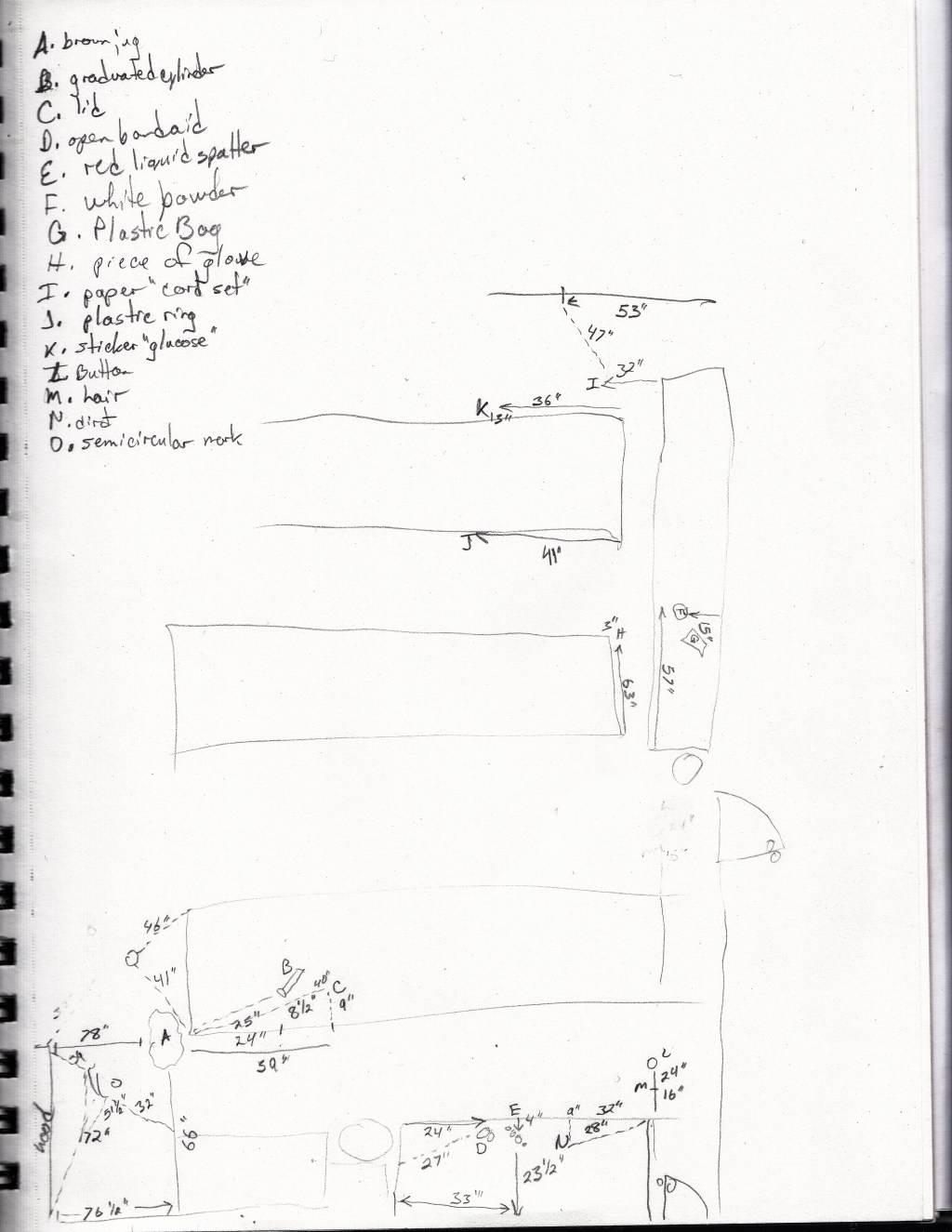 Investigators are taught that you start taking notes – one of the three main ways to record a crime scene – even before you enter the scene. You begin with the statement of the responding officer(s) and possibly witnesses. Once you walk into the scene you are recording what you see, feel, and hear. Smells, an ephemeral impression, have to be captured immediately before they fade. Cigarette smoke in a non-smoker’s house. Gasoline at an arson scene… As they walk through the first time, the investigator is not touching anything. He is taking notes, possibly photographing, and beginning a rough sketch. Those are the three ways he will record (video is rare, and usually done later) the scene.