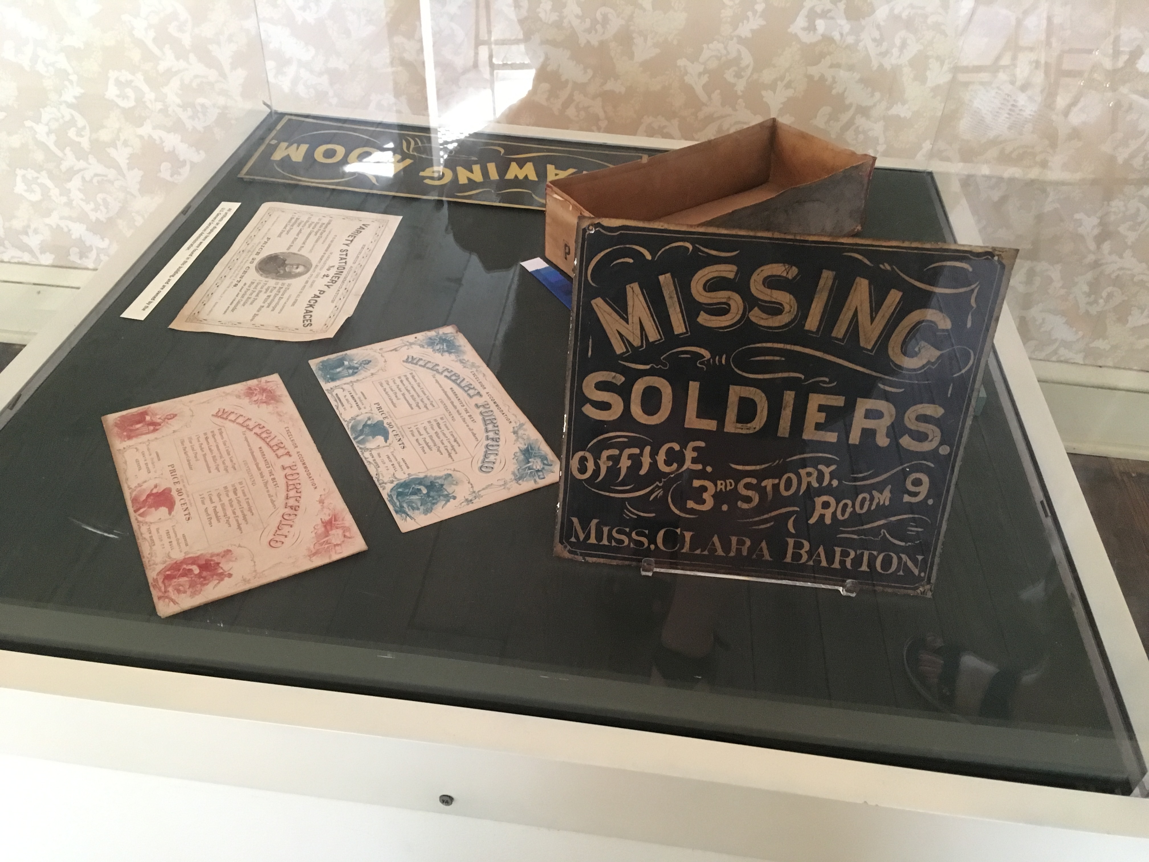 Clara published rolls of men known to be missing, compiling those lists in her office at the top of this Washington DC building. She slept in a small room, and in the larger rooms she paid 0.50$ to have a mail slot cut into one of the solid oak doors to accommodate the correspondence of her Office of Missing Soldiers. In the time it was in operation, she received more than 60,000 letters from those who mourned missing men, or those who had seen a name they knew on the rolls, and could say they knew what had become of them. In return she or her assistants sent out almost 45,000 letters asking for more news, acknowledging the letter-writer… or telling what was known of the missing soldier. It isn’t until you see the rooms, with their tiny wood stoves, gass lamps, and transom windows for ventilation, that you can begin to comprehend the monumental accomplishment of finding what had become of 22,000 men.