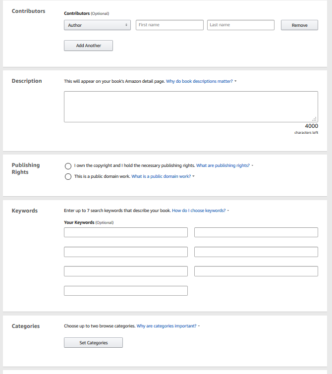 Then I go back up to the Keywords and think of what might work. This is something you might also want to research ahead of time. There are lists . . . https://kdp.amazon.com/en_US/help/topic/G200652170