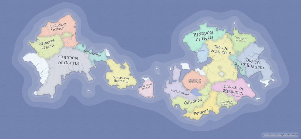I don’t know if it was my browser, but I was unable to download a jpg file from the generator, which was fine, I just grabbed a png instead. In the generator, you can really zoom in, down to the cities as dots and placement of major routes. You can set the maps to show heightmaps for terrain, or plain, or with artificial divisions like states, religions, diplomacies, and others. The map generated the names you see above, which are interesting, but you can also enter all your own.