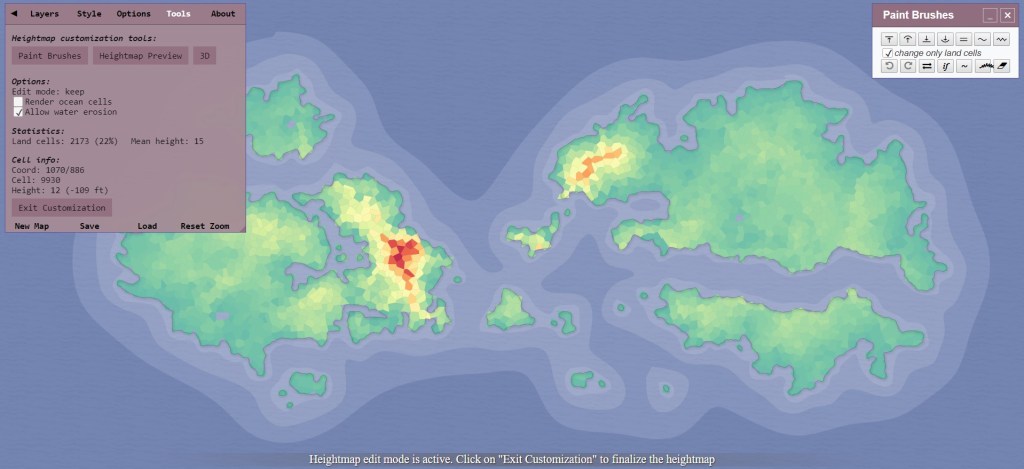 And it turns out it is MIT licensed, and source code can be found at https://github.com/Azgaar/Fantasy-Map-Generator. The developer credits Amit Patel’s “Polygonal Map Generation for Games” as one of three inspirations, which I can totally understand. Patel’s work generates a map of an island, with several varieties of basic shapes, generating elevation, biomes, river systems, etc.