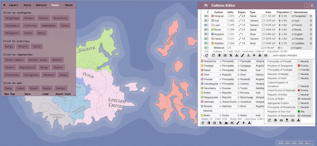 Azgaar’s Fantasy Map Generator is a fun tool for the writer, or the gamer. It’s a minimalist look at first, but offers deep details if you start playing around with buttons and settings – including the ability to put in your own names for states, cities, rivers and much more. You could spend a ton of time in this. I did not. I was messing around with it to show you all something fun you could use – but I was also mindful that I had fiction to write!