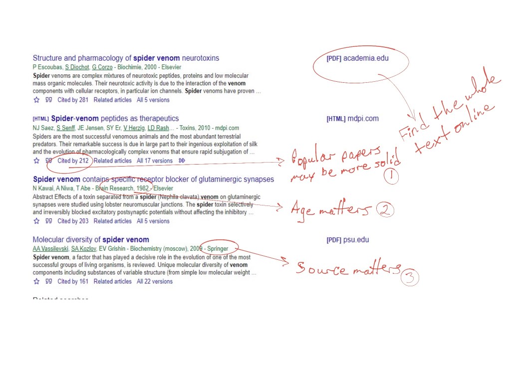 If you search Google Scholar for a phrase – in this instance, I used spider venom, you will get a long, long list of results. Search string design is a whole ‘nother topic into itself, but I wanted to give you an idea of what you’re seeing here. The second column off to the right is where you can find the entire text of a paper, and in what format. Results with nothing in this column will require login access, either through an institution or library, or by you paying for it. Most of the time for the level of research fiction requires, you can get away with just looking for the open-source papers. My footnotes…