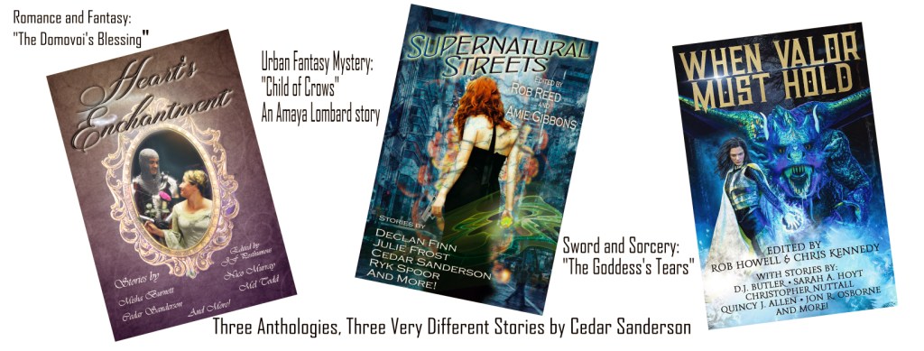 Then the rollercoaster ramps up again, and within 24 hours I get to publicly announce that three of my ‘secret’ projects from last year are coming soon! I have stories in three anthologies that will be released in the next couple of months. I went from never having been invited to participate in an anthology, to getting an invitation at LibertyCon and it snowballed from there. Whee! I’m so excited to finally show off what I’ve been writing!