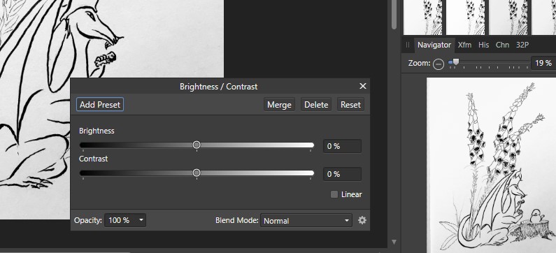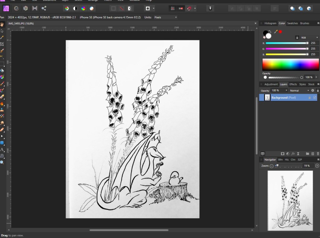Here, I have photographed a page from a sketchbook, and imported that into Affinity Photo. You can see the shadow on the page has translated to ‘gray’ in the image. If you were doing this properly, you would ensure that you didn’t have any shadows. I have said I make a lot of mistakes? But don’t worry, it can be done away with. Removing shadows just takes a little longer. Why don’t I scan the art? Well, my current scanner is crap. And I don’t feel like spending the money to replace it. In fact, if you squint at the top of this screenshot, you’ll see that I took this photo with my cell phone (I’ll also note I bought my phone for the high megapixel camera, you couldn’t do this with most cell snaps).