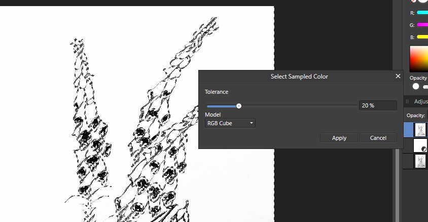Now you can see all the flaws. I’ll use an eraser brush to get that white line off to the left side of the image – it’s the edge of the paper. I’ll use select by color again (at most, I’ll have to do it 3-4 times, 1-2 is more common) to eliminate the gray pixels. At this point, I’ll hide or delete the black layer. Sometimes, for images with delicate lines, I’ll duplicate the image layer, and then set the top one to ‘multiply’ to make darker linework. And then I’ll save it as a png file, checking the box to not save any hidden elements.