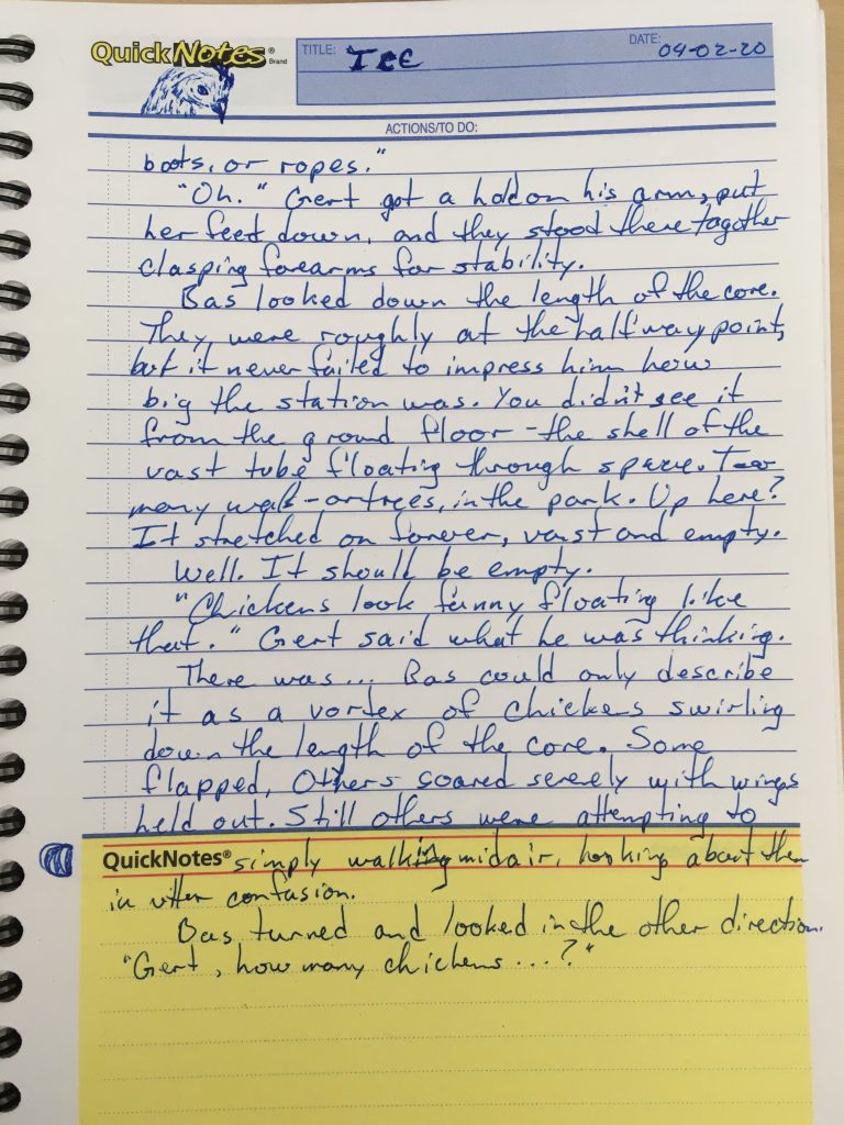 I can read my own writing, at least. Which is good, because recently I’ve been doing a fair amount of writing longhand into a lined notebook. It’s not that my muse insisted. No, it’s that I have been bored out of my mind, and it was sit and stare at the wall, or I could write. Writing on my phone would not be a good optic (and my phone battery is dying, to my annoyance since it’s not one that can be replaced easily) so a small notebook is the option. And as I type up my efforts in the evening I realized something about writing longhand. It forces me into writing shorter. Not necessarily short stories – although most of what I’ve produced in the last month have been a short, and then a children’s chapter book (still in progress. Yes, I am finally writing a children’s book! No, this one hasn’t got dragons).