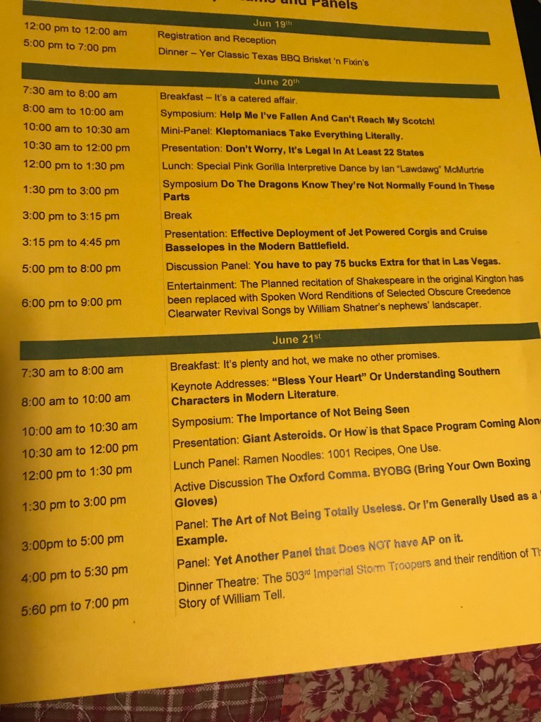 aside from my need for social interactions at least once a year, the stories… listening to world-class storytelling is priceless. That some bits may wind up in my own stories? Perhaps, but more likely my brain will feed all of it into the gristmill and it will come out as something new or at least with the serial numbers filed off. Except for Lawdog’s python tale. That one is uniquely hilariously his own.