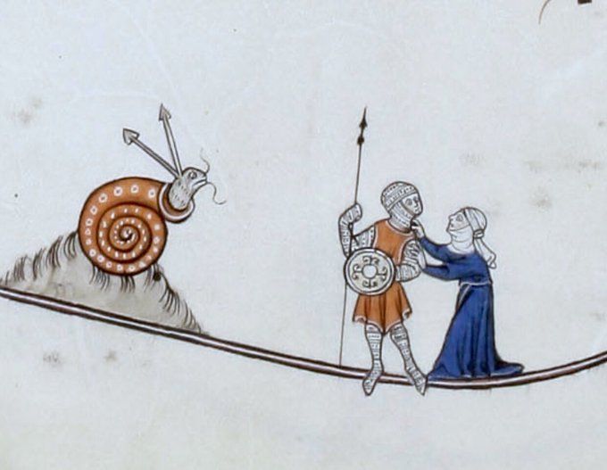 There was an invasion of giant snails in the thirteenth and fourteenth centuries. This event, not written about in any edrudite histories or commentaries, but it comes to us through the illuminations of monks.