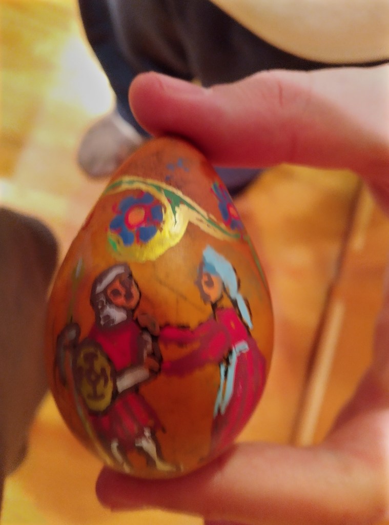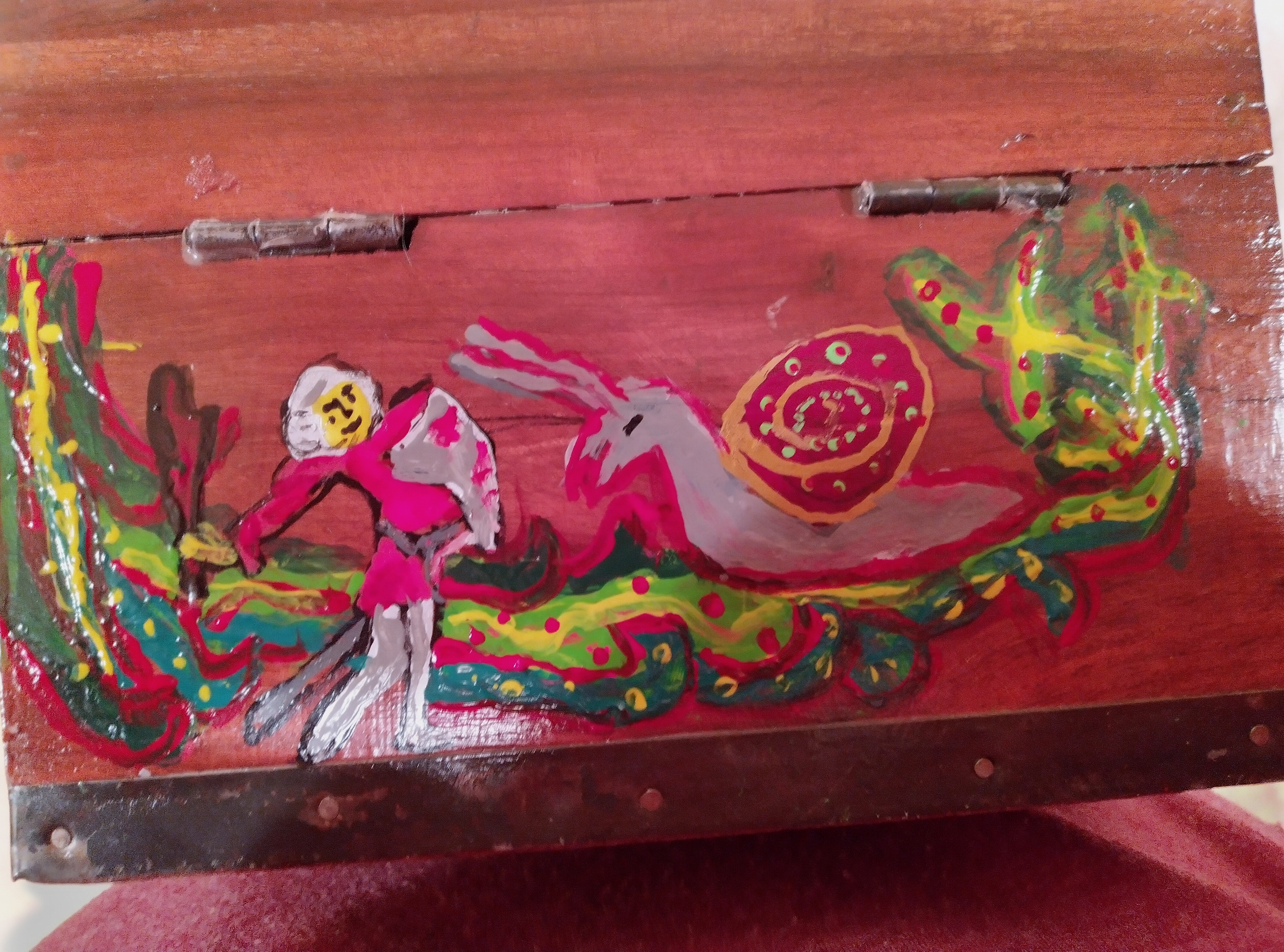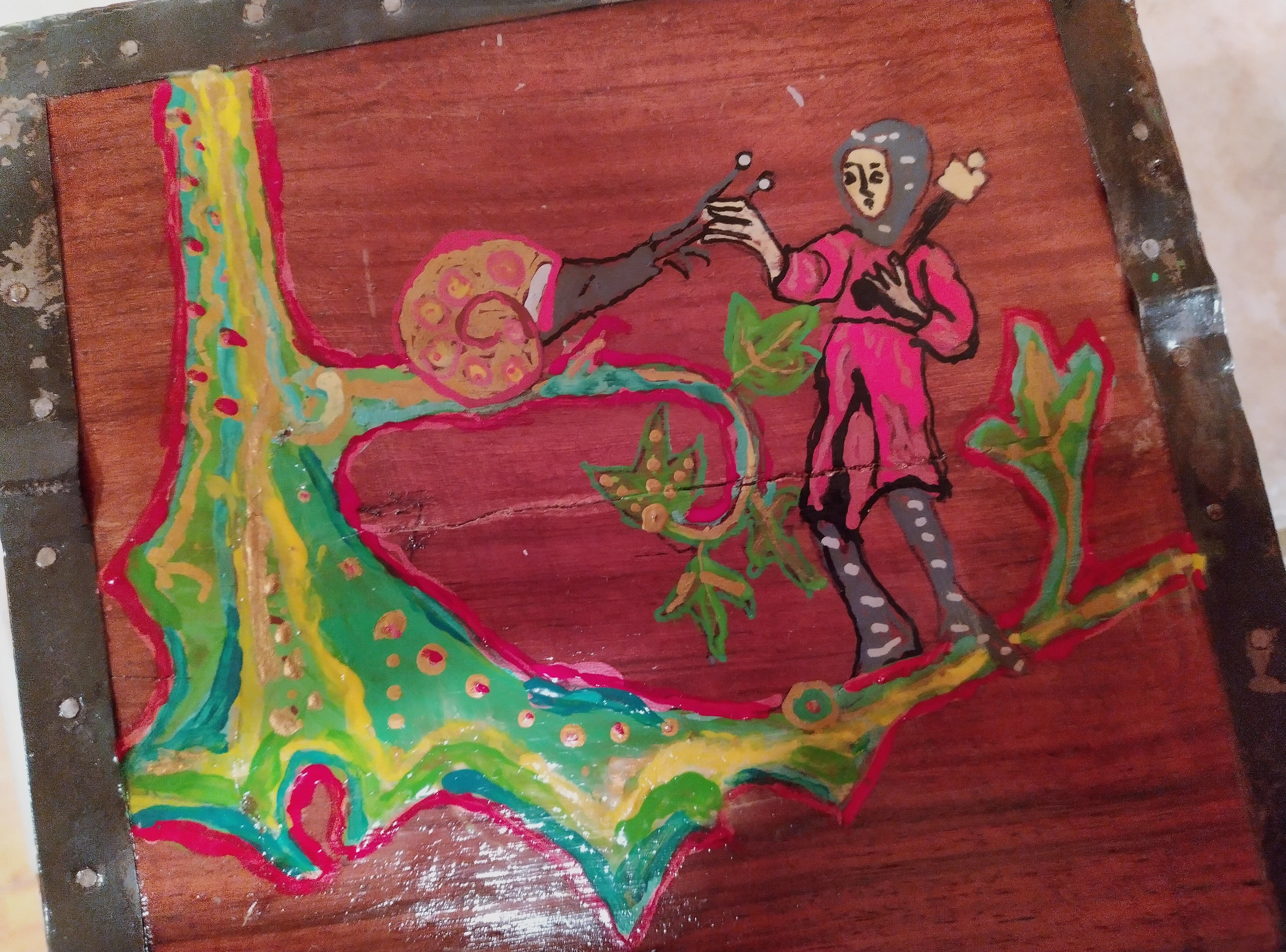 …. and of course, being me, I’ve been painting things with knights fighting snails. The first was an upcycled box, and now I’ve branched out to egg gourds. All of which probably means I’m not right in the head, but hey, it’s fun. And yes, I’m copying (kind of) medieval illustrations.