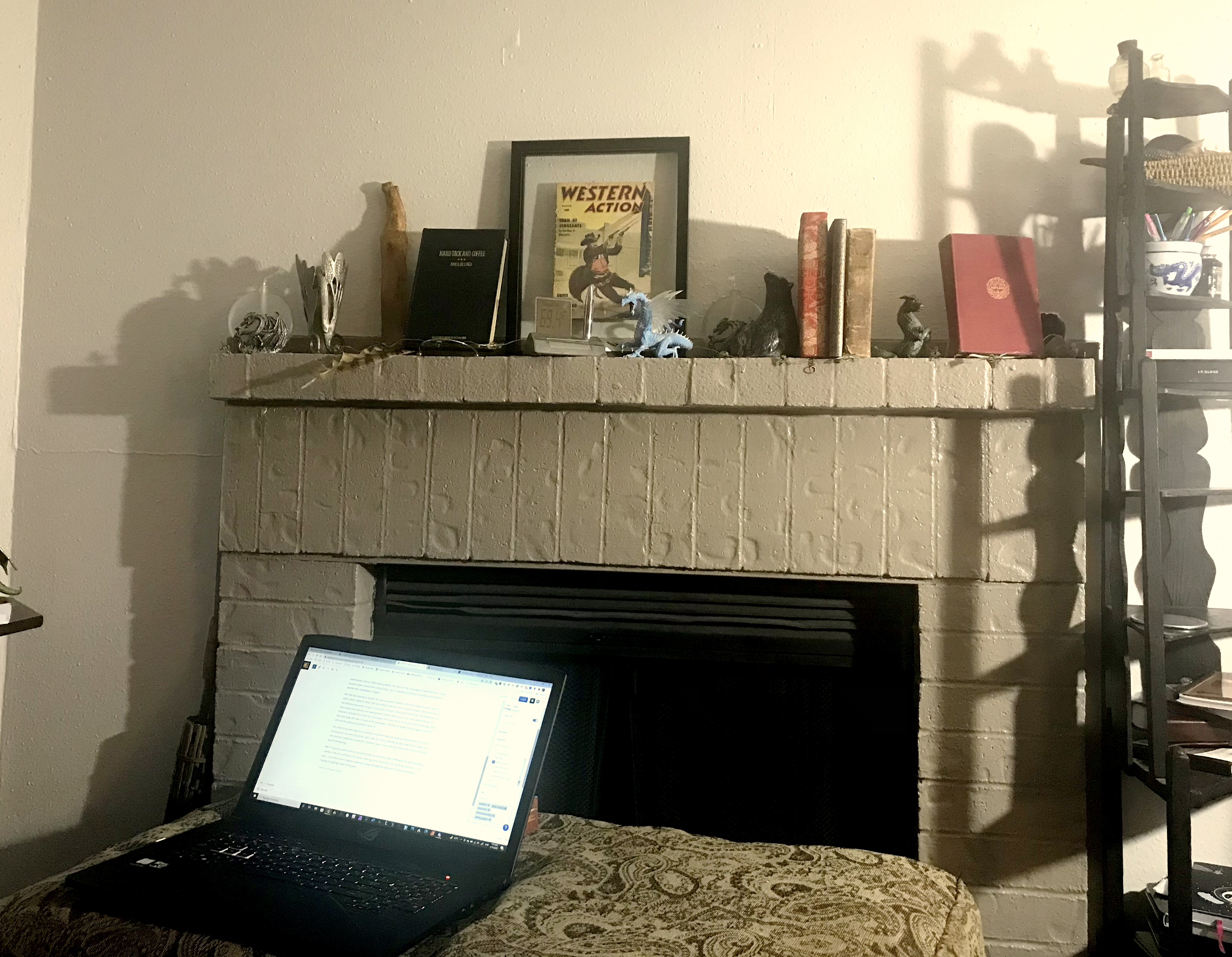 Writer’s block is a bad thing, we think. We want to go in a direction, and the way is blocked. It’s not actually blocks that can be moved and built with. Or is it? Perhaps the block means it’s time to hang that left at Albuquerque and go check out the rattlesnake museum I’m reliably informed can be found in that city. When I’m sitting at the keyboard with my fingers hovering and my mind uncharacteristically blank, maybe that’s the time to look up at the wall instead and let my thoughts wander. On my wall, from this chair, is the mantel over our so-far-unused fireplace, and on the mantel are several dragons, an art deco vase, a cypress knee that looks a little like a horse’s head, a book titled “Hard Tack and Coffee,” an owl’s feather, a framed pulp Western magazine, a mother bear nursing two cubs, a set of bonsai tools in a beautiful brocade case, sketchbooks, and an 1880s Kipling edition. Oh, and a string of fairylights shaped like bees. If you couldn’t make a story from some of that, I don’t know what to tell you. Possibly a story about a woman who resembled a magpie.