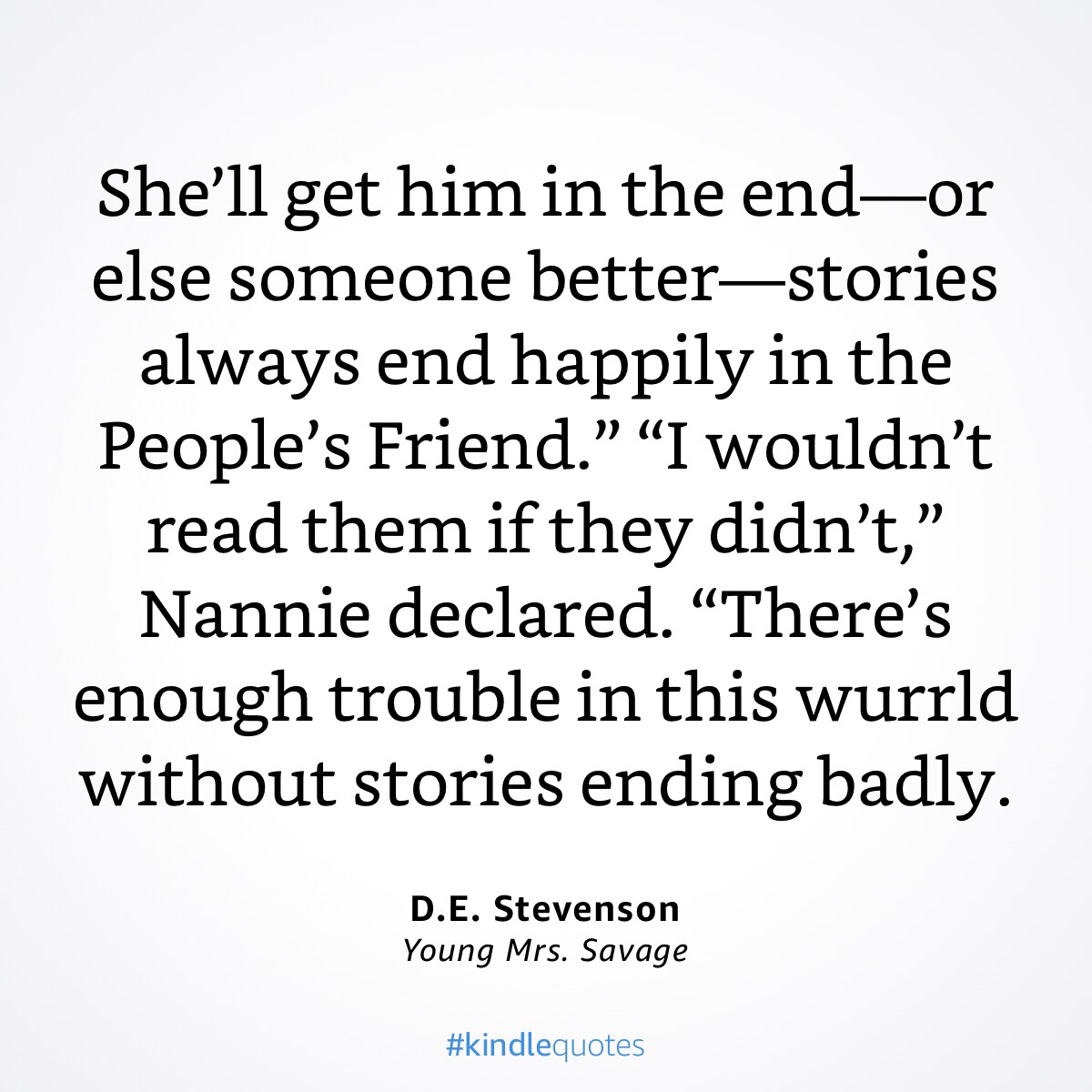 The Young Mrs. Savage is not one of my favorite DE Stevenson’s, but I wanted this quote to share. It summed up neatly why I was reading that book to begin with, and some of the philosophy behind my own writing. I trust that, when I read a Stevenson, I will find at the end happiness and hope for a better future. It’s not always an unalloyed joy… but it is there. Her stories are more quiet than dramatic, and in the last few months, have been the perfect anodyne for my own life.