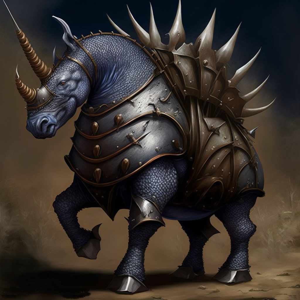 I could, by they way, keep on iterating with this image. I know from experience that I’m likely to see more distortion the longer I do this, however. Usually a few iterations is good. Too many, and you start to get frankly Lovecraftian. If I were anthromorphizing MJ (which I totally do, all the time) I’d say it gets confused about what I want, and starts adding or subtracting. Because this particular AI is not collaging from images it’s been trained on, but rather rebuilding techniques to create images based on my prompts, it’s going to have trouble with things like, say, anatomy. However, V4 has made a giant leap forward in terms of stuff like, say, horses. Or Battle Unicorns.