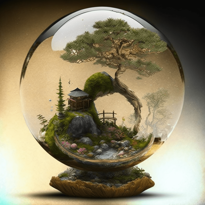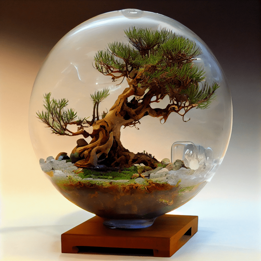 cutaway view, experiment on translucent liquid sphere terrarium aquaponic pine bonsai, hyperdetailed –v 4