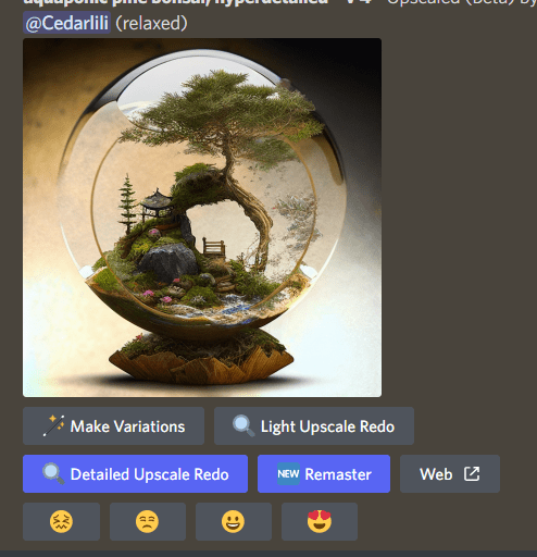 Finally, I tried out “Detailed Upscale Redo” to see what I’d get. Immensely more detail, leading to a somewhat cluttered image, and the return of the characteristic MidJourney noise. The resolution here, interestingly, is 1536px square, a reduction from it’s parent image.