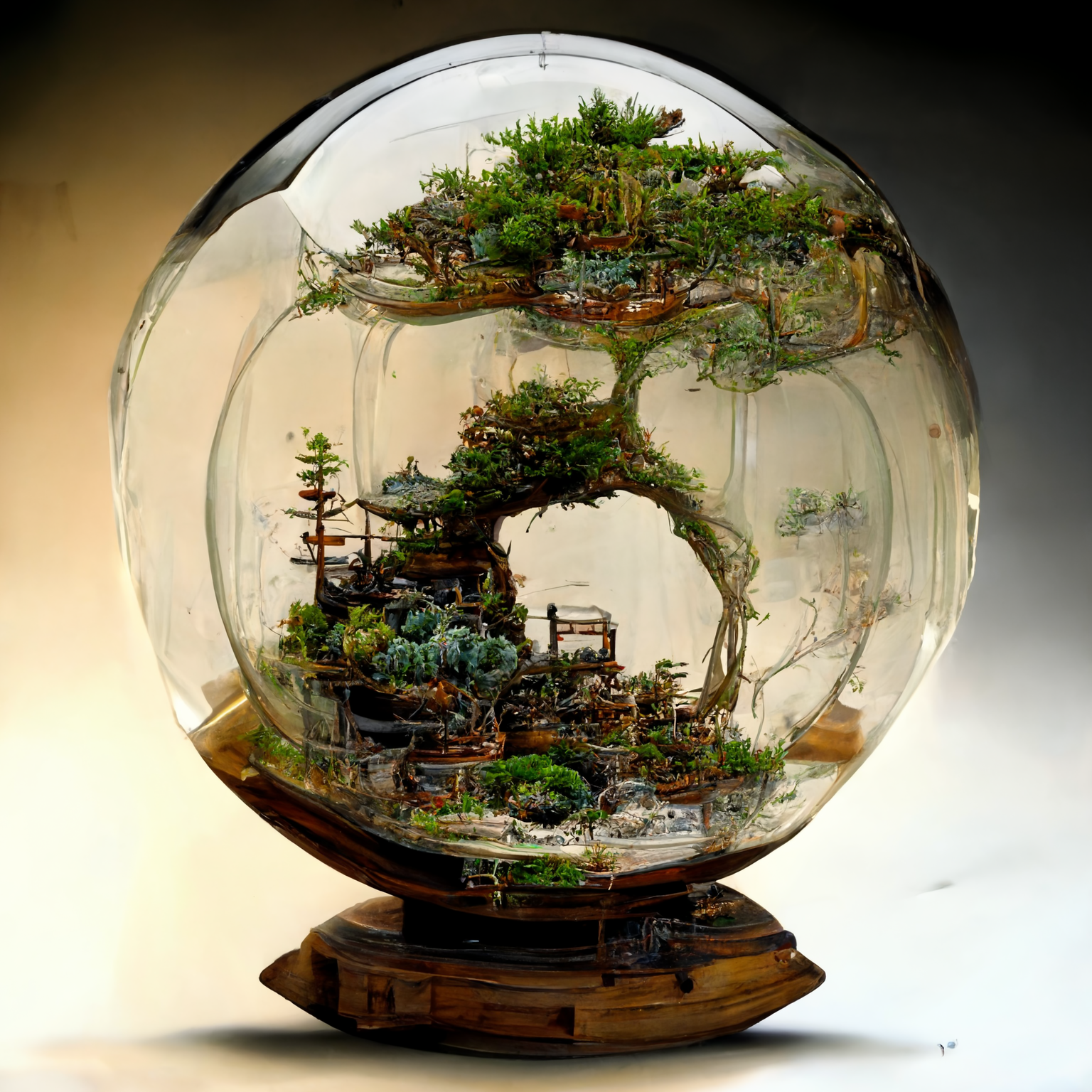 cutaway view, experiment on translucent liquid sphere terrarium aquaponic pine bonsai, hyperdetailed –v 4