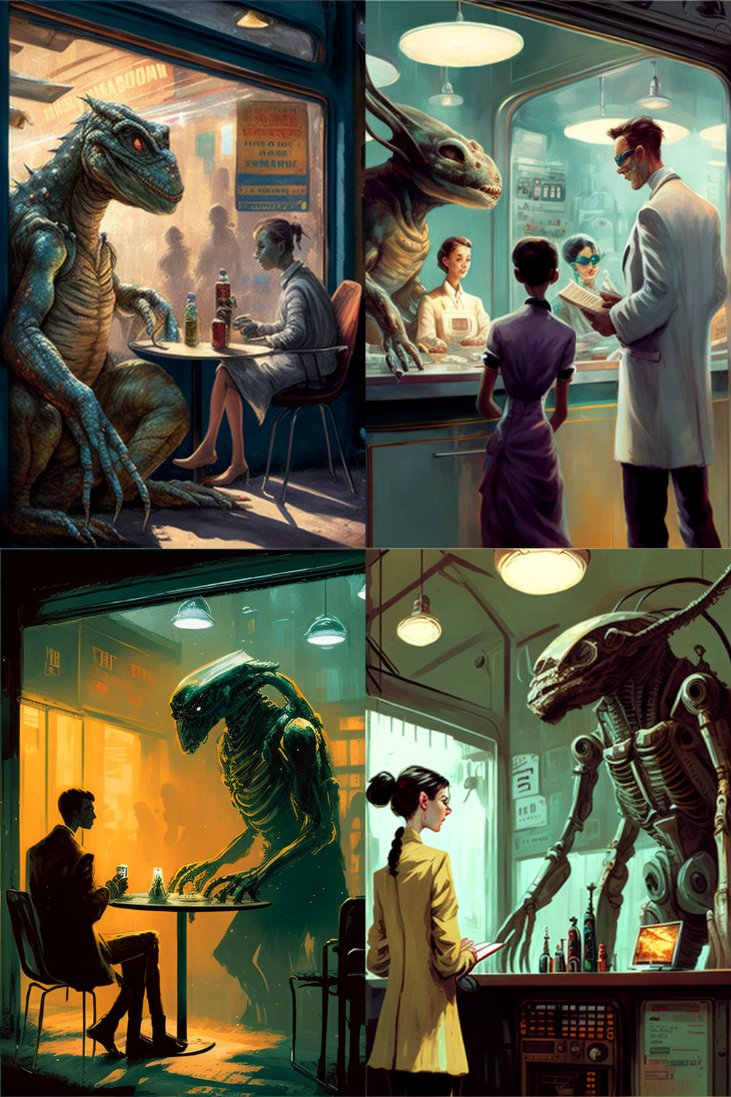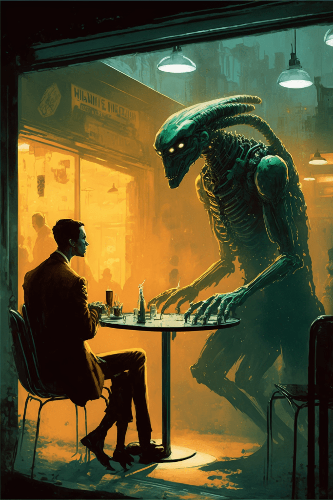 The bartender looked down — his? its? — long blue proboscis, somehow silently conveying ‘Tourists!’ and a worlds-weary sigh. An expressionless voice issued from the translator. “I do not recommend it, sir. That drink is incompatible with Terran biochemistry. You would die most horribly.”