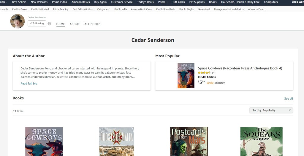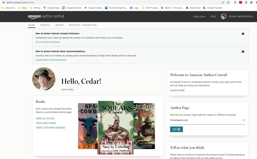 One thing with images and author photos – Amazon tends to crop photos to fit their template. If your original is off-center (as was the one I’d planned to use), you might not end up in the picture at all. (I think it came down to the edge of my hat, and then the background). That might work, or might not.