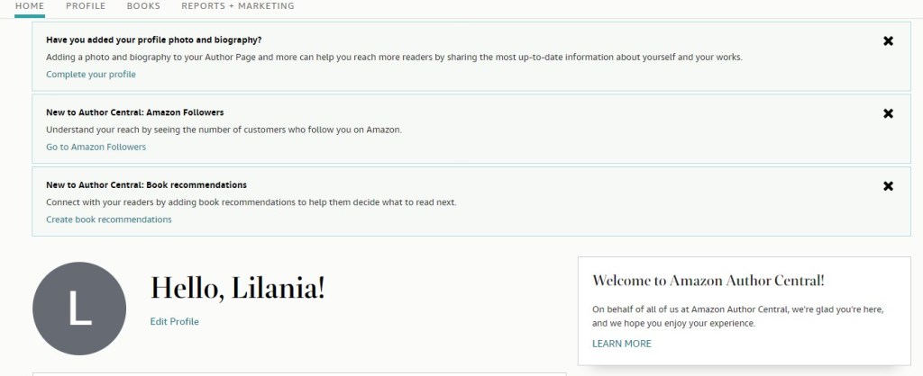 Once you have navigated to the initial author.amazon.com page, you’ll see the join or sign in options. If you have a kdp account (the Indie Author’s publishing account) you can use that. If you don’t, no worries, you will be walked through the sign-in process. Once your account is up, you’ll be prompted at the top to complete some basic tasks. I’ll be working up my open penname, Lilania Begley, to show you the process.