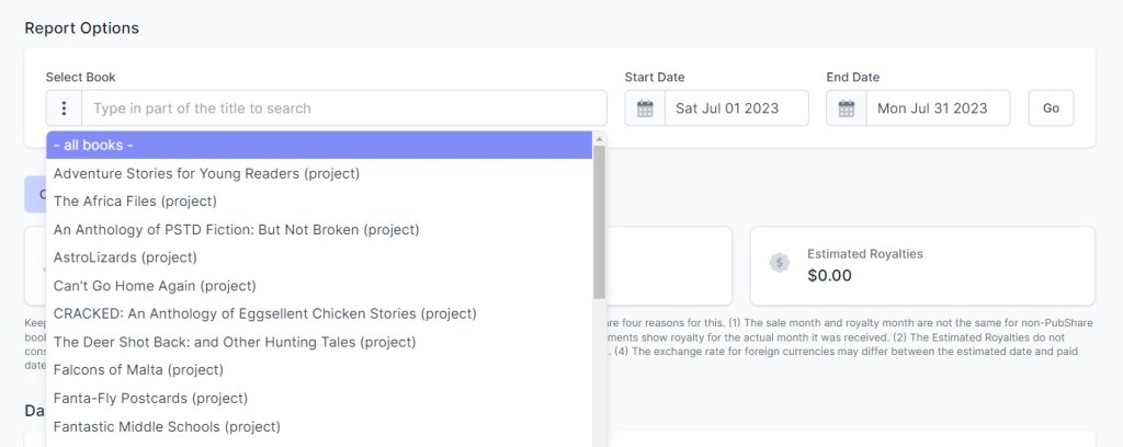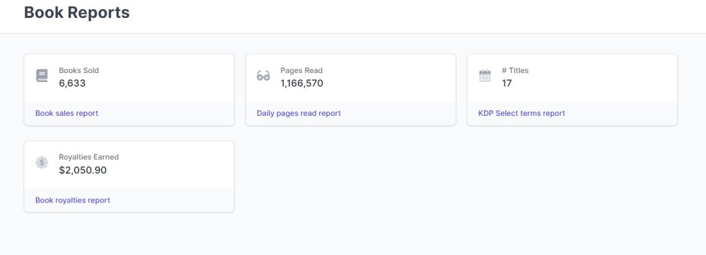 Once in book reports, the top selection, you have even more options to explore. The book sales report tracks sales of ebook, paper, and hardcover books. Pages read tracks the titles (you’ll see I’m involved in 17 such) that are enrolled in Kindle Unlimited. And finally, the royalties earned tracks actual royalties, not just the projected earnings (which means this lags by a couple of months). All of these numbers are lifetime, following you from the time you set up the account and become involved in active projects.