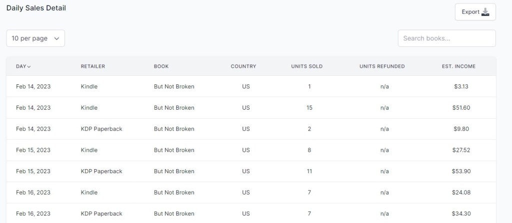 Below this is your daily sales detail, which tracks country, units (you’ll see the retailer sorts ebook from paper, and the book I’ve chosen for this is in KU, so I can’t show you what wide distribution would look like). You’ll note that you can export this so you can track the data and break it down in ways you might need, and could make pretty graphs, too! The far column is ‘est.’ as this is estimated, actual royalties are reported elsewhere. My example is from a few months ago, but if you are looking at the past week, say, returns are still possible, and that can affect the income column. Oh, and income here isn’t royalties. This is what the books bring in with a sale, which is then broken out across the participants in a project.