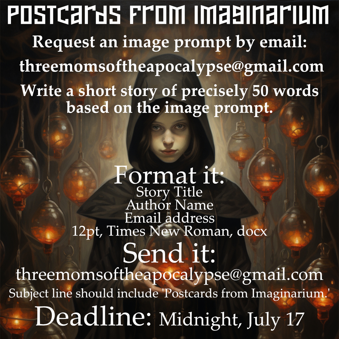 First order of business… There’s a postcard challenge open while two Moms of the Apocalypse are off having fun at Imaginarium in Louisville, KY. I’m the stay-at-home mom, a role I’ve worn for most of my adult life. So! email for a prompt image, and then write a 50-word story, format per instructions, and submit it. It’s a great little exercise in whimsy and it could wind up being published, you never know.