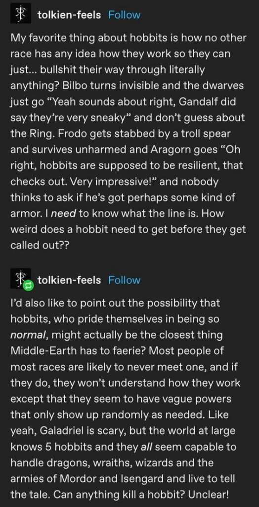 Which does tend to support that “everyone else thinks hobbits can do anything” meme, since Aragorn seemingly assumed they convinced their orc captors to stop for second breakfast. Or possibly elevensies.