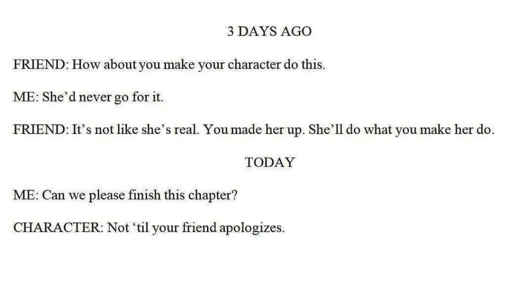 That’s how it is for me. People arrive and make themselves at home in my story, and I don’t know who they are. Happens all the time.