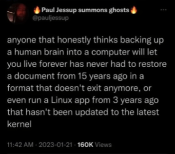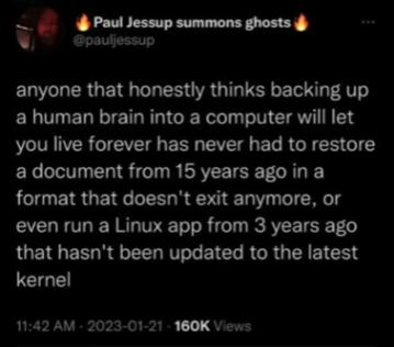 I’ve been saying that about backing up brains (and AI, for that matter) ever since I first heard it.