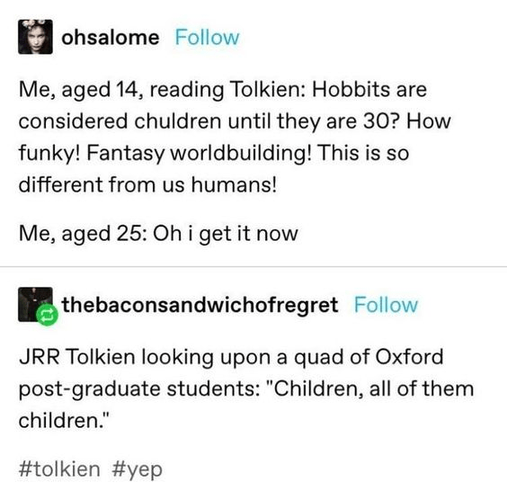 One of my favorite moments in the film adaptations of Lord of the Rings is when Aragorn, Gimli, and Legolas are tracking Merry and Pippin, and the find where the orcs stopped for a meal. Viggo Mortensen as Aragorn shakes his head slightly and sighs: “…Hobbits.”