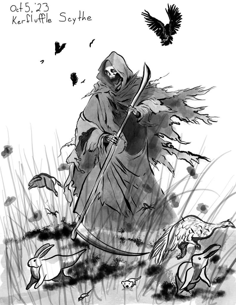 And I can’t quite tell if it’s reapering time, or if the Grim Reaper is shooing the local wildlife out of his vegetable garden, which makes it kind of hilarious.