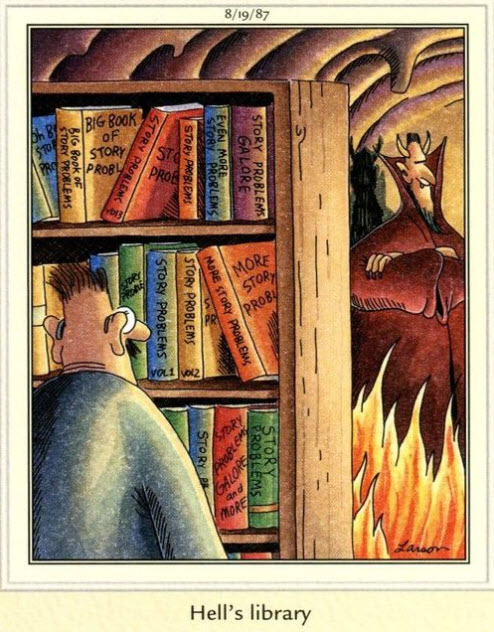 There are a great many things I like about writing fiction. One of them is Story Problems. In the cartoon above, Larson meant the term to suggest those irritating examples of applied arithmetic you may remember from grade school, but I use it as my personal label for those situations where your fiction story has wandered off into the Tepid Swamp of Niceness, or the Crippling Boulder Field of Inconsistency.
