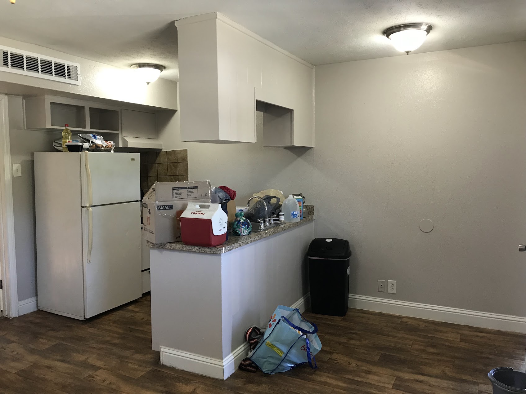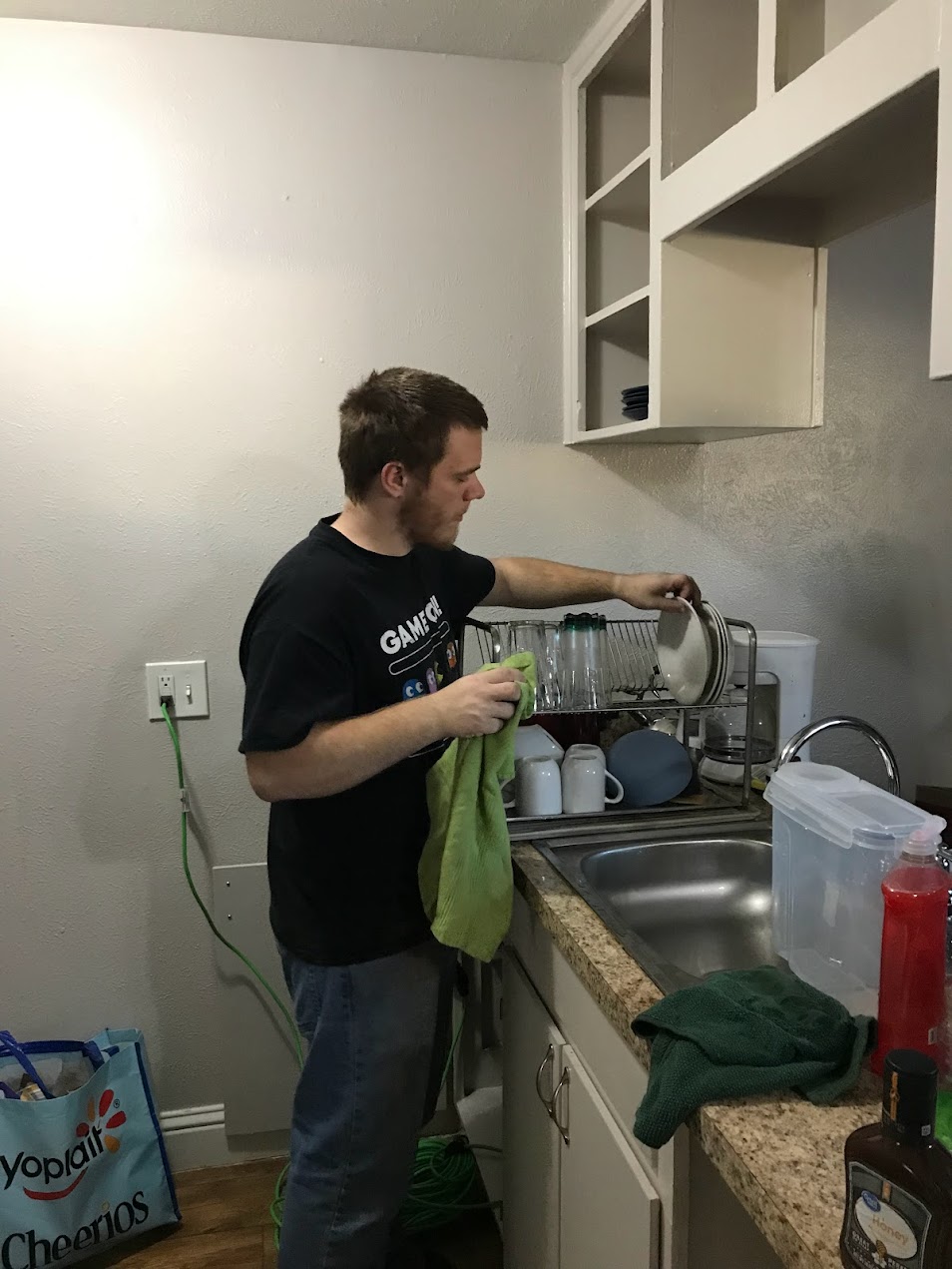 The header image is his recliner, TV, and that’s about all a young bachelor needs, right? Not shown – he has a table, a bed, a desk (and a chair), and we got him an end table with shelves to keep next to the recliner. All the furniture he needs and has space for! He’ll pick up a bookshelf and be all set at that point.