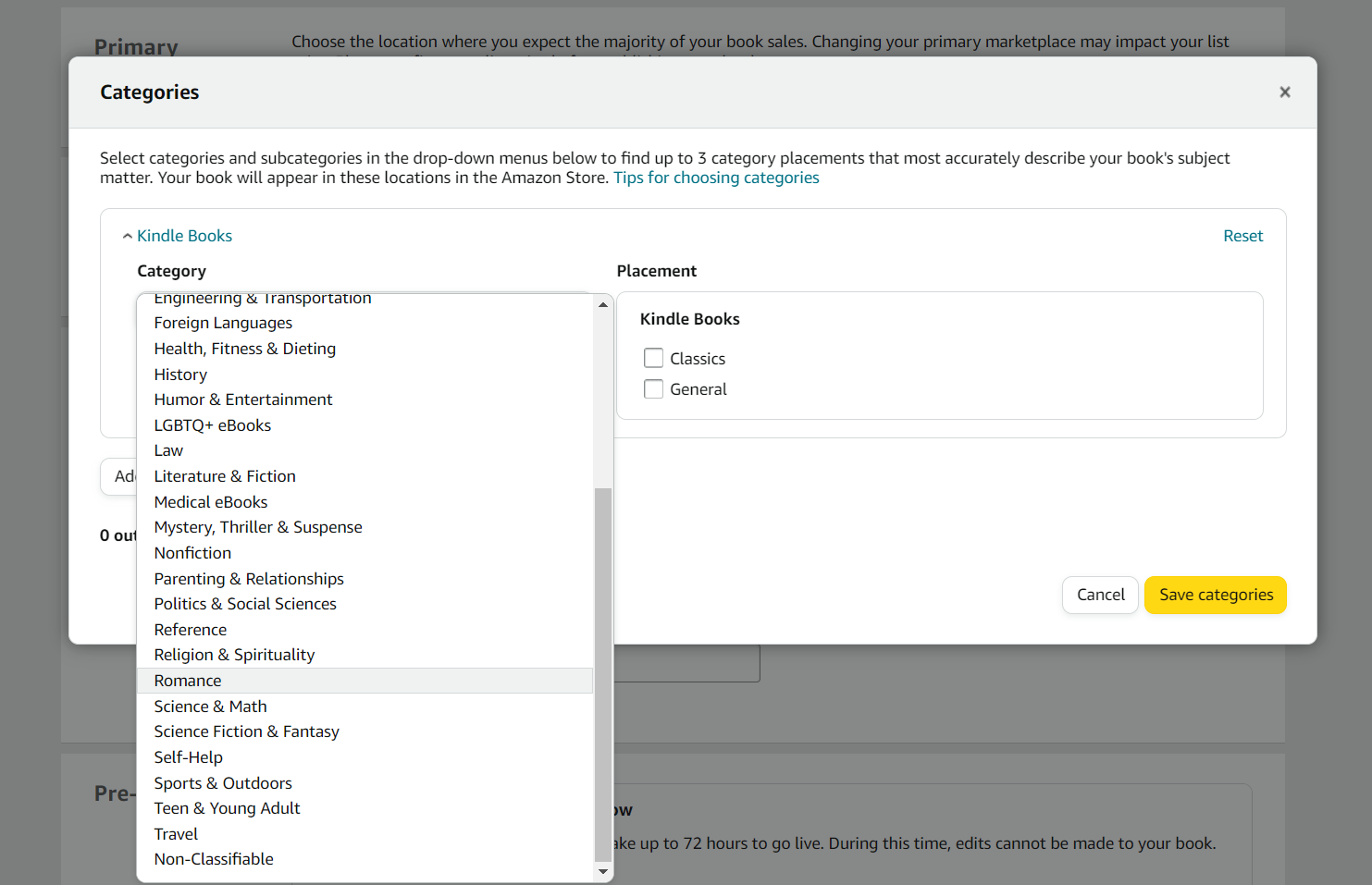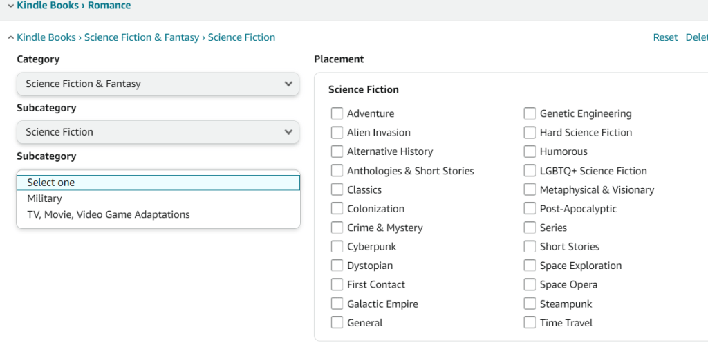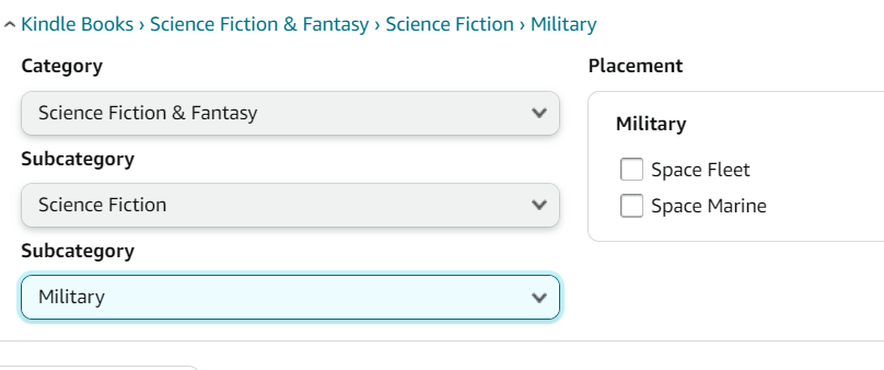 I’m not an expert here, but I do know this… the subcategories indicate the larger groups. So Military, up there in the dropdown? Huge. Your book may drown in it if you choose a more generic ‘Mil SF’ as your only category. There are some even narrower niches to put a book in, which may help. Possibly. Use all three categories, to give your book a fighting chance. And know that Amazon will also slot the book into more categories of their choosing, based on the keywords and other factors.
