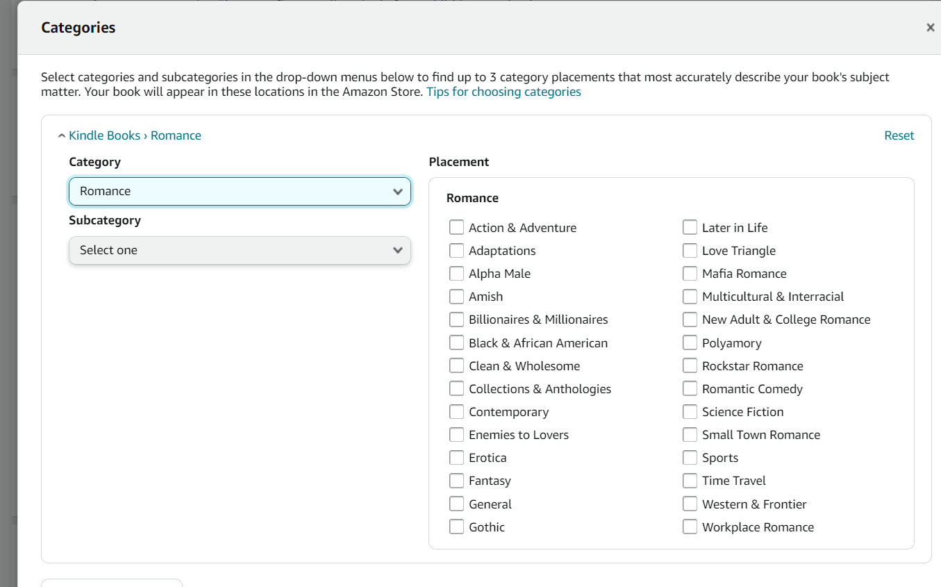 Some of those words aren’t going to apply, as they tie into characters – but if you are writing a series, do use your MC’s names as keywords, so readers looking for them can find them (or better yet, use the series set-up). With romance in particular there are code words you’ll want to learn and use. Short and sweet, slice of life, cinnamon roll… they all mean things. Things you can use in selling your book to readers who are looking for those things.