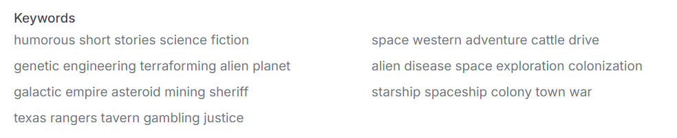 That’s not a screenshot from Amazon. And it’s not my work – it’s from CV Walter’s setup of one of the Raconteur Press’s Space Cowboys anthologies. She really is an expert on this, and I wanted to show you what a real professional does. I’m learning from her, and if you can ever find her at a con with a few minutes (woman is busy!) ask her about keywords. She’s amazing.