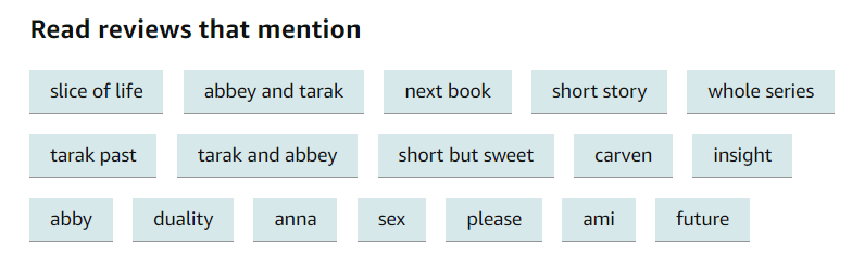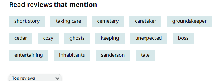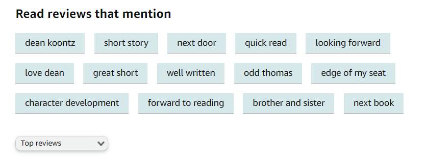 But where do you find keywords? Look at the comps – the stories like yours that are out there and are selling well. Then look at the tag cloud of words above the reviews. Here’s one from a Dean Koontz short (not sure what it’s doing in 45-min romance reads, but hey…)