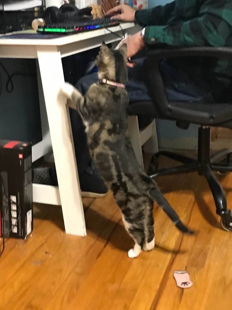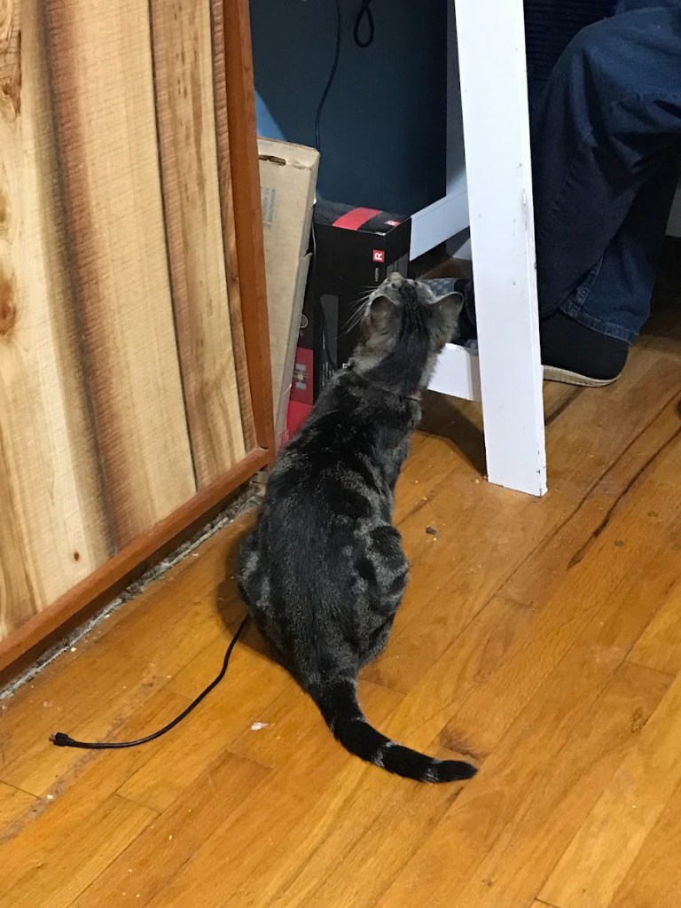 She sprang, full at the screen, paws spread wide and ready… and splattered on the glass of the wall-mounted monitor. Both humans in the room doubled over in laughter. She proceeded to try again, while the First Reader was trying to shut down the tab and ease her newfound enthusiasm for his space. Then, for several minutes, she was convinced there was a bird in the house, she’d seen it, and was up on his desk and looking behind the monitor, all over, getting down and looking under it… Poor little lady. All the instinct, the experience, the training, and it was a fake bird!