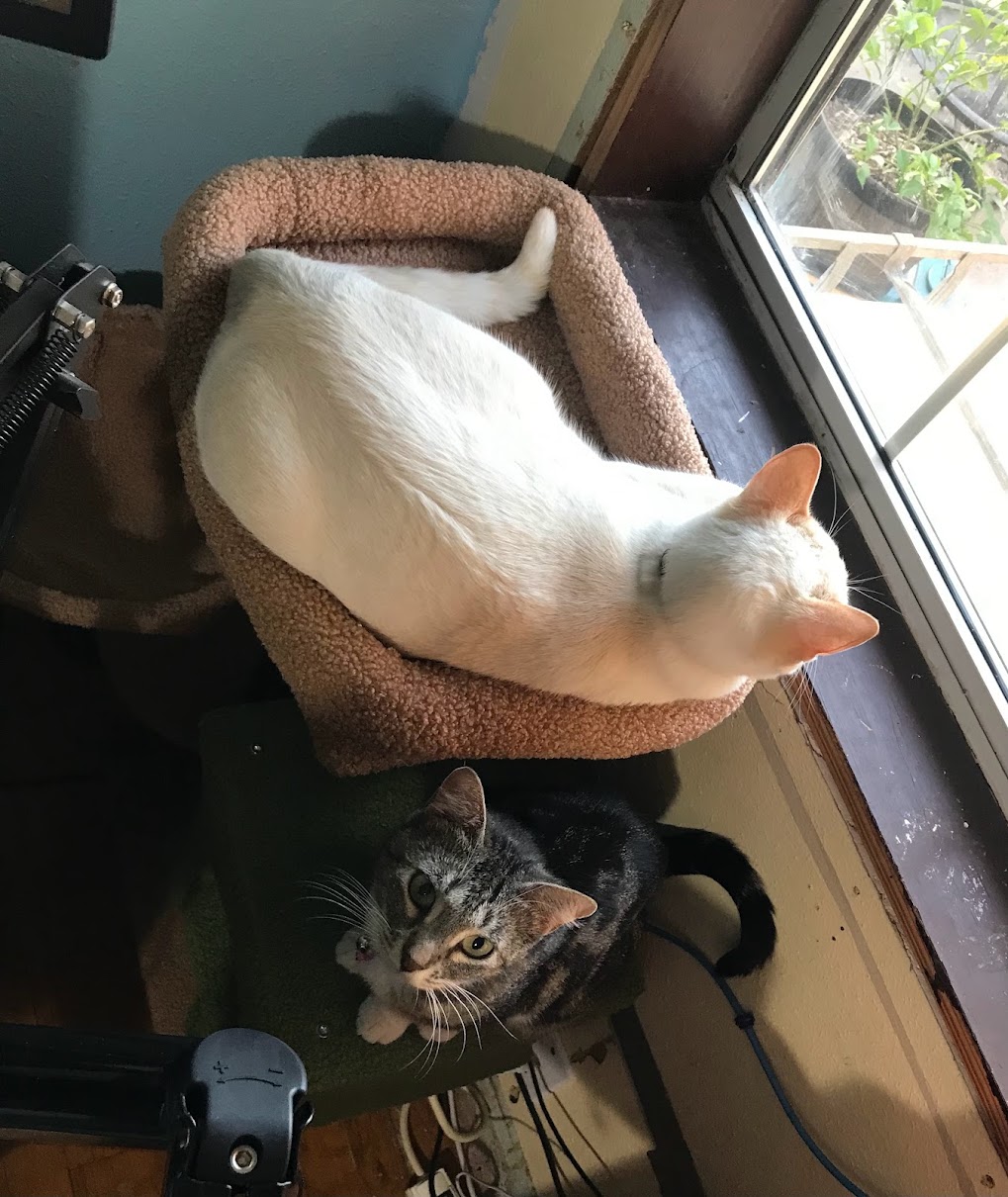 We started out our morning quietly enough. My husband, the First Reader of my writing, doesn’t sleep well any longer, so he had been up in the night, with a cat in his lap as they so often do these days. While doing this, he’d been reading a book, and had put CatTV on to amuse the feline. Toast is accustomed to this, as he’s done it for her since she was a sub-pound scrap of kitten and all four of them (her siblings we fostered for a couple of months) would avidly watch the videos of birds, squirrels, and movement on the screen.